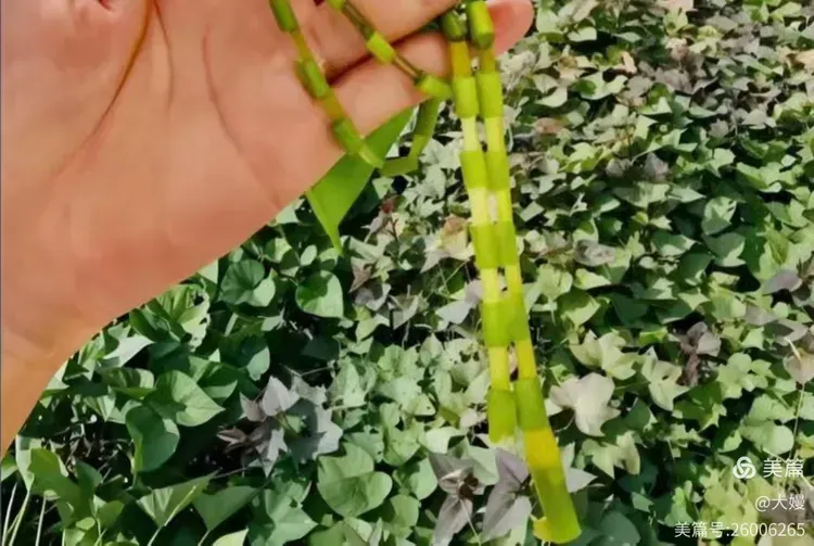 待到地瓜快成熟时,我们小孩子就乐意跟大人上山了,因为这时候可以拿地瓜藤做项链了。选一截粗壮且无损伤的红薯藤,去除叶片,保留光杆,将藤杆一节节掐断,隔一节去一节,去掉的一节只保留藤皮,连续掐节成串,首尾连接成环,长的可戴在脖子上,短的可挂在耳朵上。在物质匮乏的年代,这算得上乡下的女孩子少有的乐趣了。